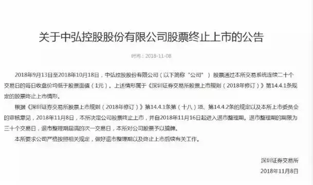11月8日晚间,深交所公告称,根据《股票上市规则》规定以及上市委员会的审核意见,深交所做出中弘股份股票终止上市的决定。同时,根据安排,中弘股份自16日起复牌,进入30个交易日的退市整理期。