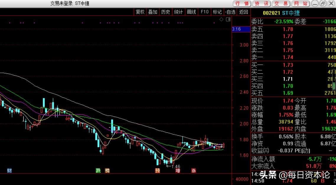 3月18日,中捷资源投资股份有限公司(下称 中捷资源或ST中捷)股价依然低迷,分时图呈现锯齿形走势。截至收盘其股价为1.74元/股,比上一个交易日涨了4分钱,总市值11.97亿元。
