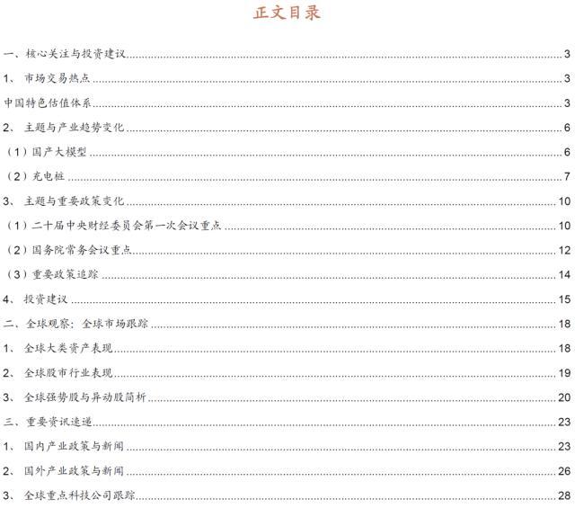 上周全球股市涨少跌多,市场交易热点主要围绕中国特色估值体系。产业趋势方面,科大讯飞发布星火认知大模型,该模型核心能力出众切且布局完善,将于年内进行多次升级;5月5日国常会提出要适度超前建设充电基础设施,充电桩再迎顶层政策助力。重要政策方面,二十届中央财经委员会第一次会议和国常会相继召开,首次提出了“以人口高质量发展支撑中国式现代化”的新提法。