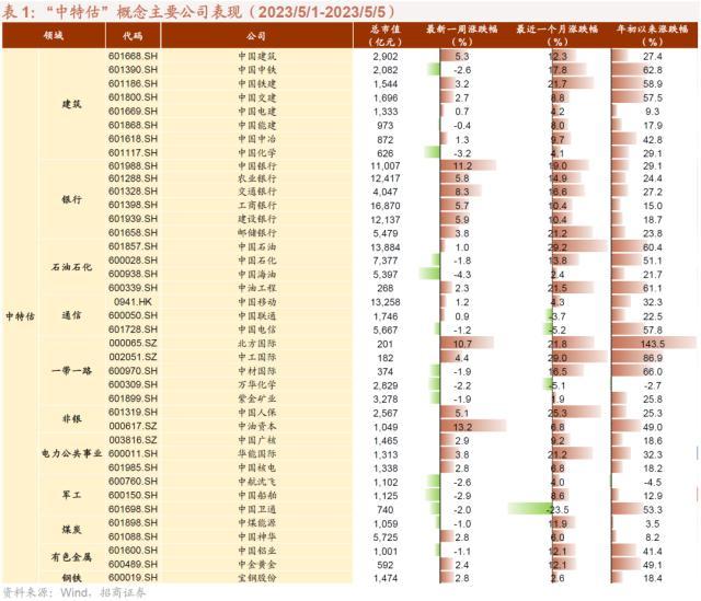 党的二十大报告中为国企改革指明新方向,深化改革,加快国有经济布局优化和结构调整,推动国有资本和国有企业做强做优做大,提升企业核心竞争力。2023年1月,国资委召开中央企业负责人会议,确定里央企考核体系从“两利四率”调整为“一利五率”,进一步加强了对国有企业的盈利能力和创现能力考核,推动国企高质量发展。2023年5月11日,上交所拟召开“发现央企投资价值,促进央企估值回归”交流会,旨为进一步探索建立中国特色估值体系,引导央企投资价值发现,推动央企估值回归合理水平。顶层设计开启新一轮国企改革,中特估企业有望迎来政策与业绩双击。