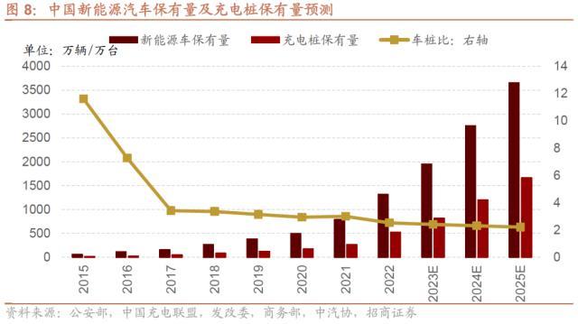 截至2022年底,我国新能源车保有量为1310万辆,充电桩保有量为521万台,车桩比为2.51。相比于新能源车总量,我国充电桩数量明显不足,近年来充电基础设施的短板已经成为制约新能源汽车发展的关键因素,国家和地方已积极出台一系列产业鼓励政策,切实推动充电桩的高效建设和合理布局。《电动汽车充电基础设施发展指南(2015-2020年)》首次提出“一车一桩”目标,在国家“一车一桩”目标指导下,国内充电桩行业的市场规模将保持快速增长,根据中国充电联盟预测,2023年我国充电桩保有量有望达到811万台,2025年有望达到1660万台,2022-2025年期间的CAGR有望达到47.15%。