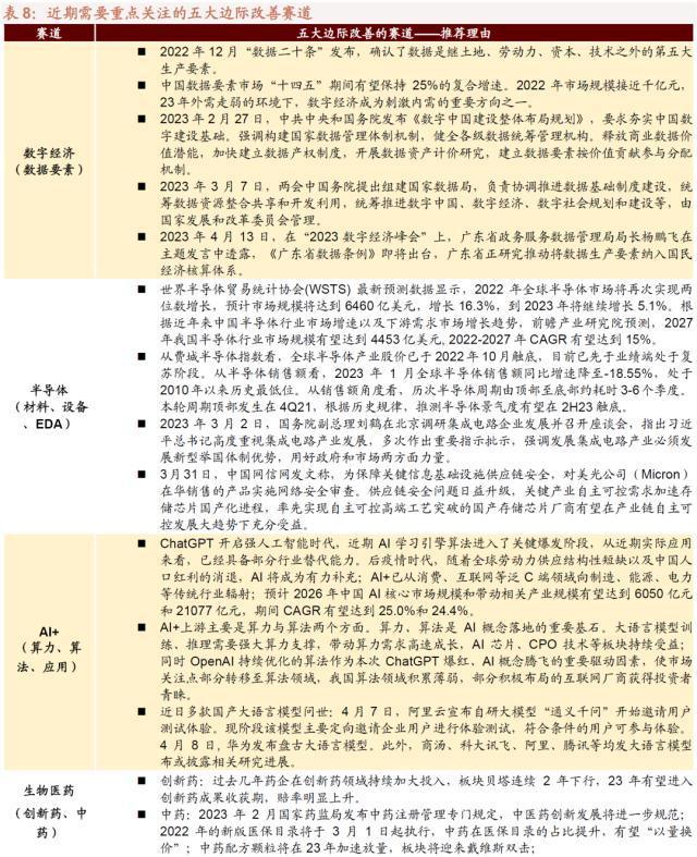 从短期角度, 5月需要重点关注五大具备边际改善的赛道:数字经济(数据要素)、半导体(材料、设备、EDA)、AI+(算力、算法、应用)、生物医药(创新药、中药)、一带一路。