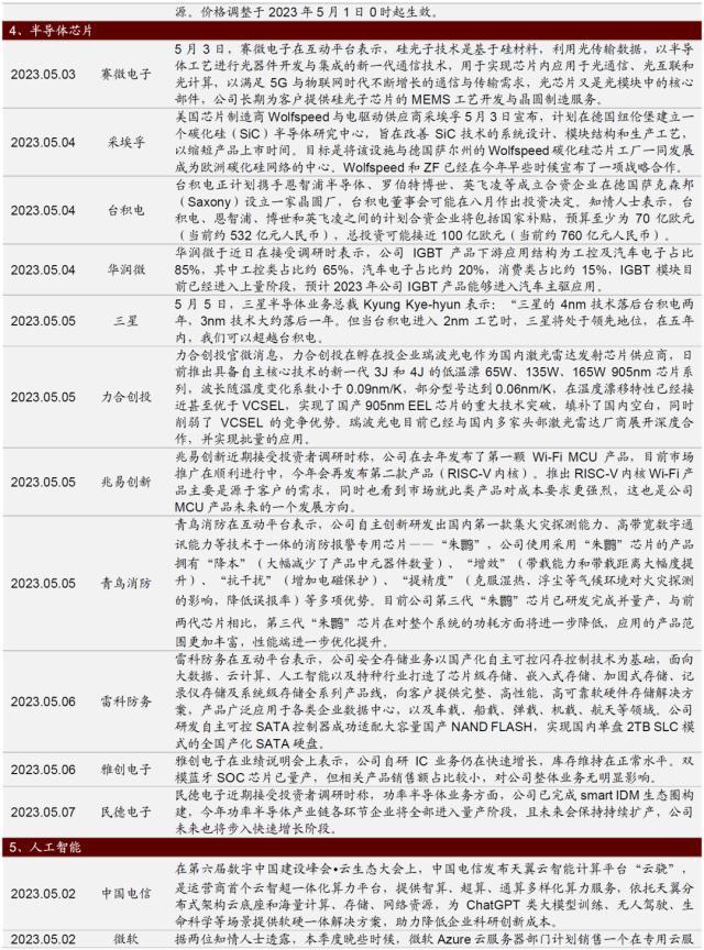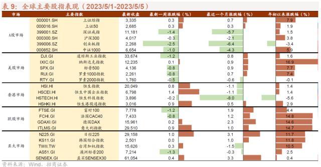 5月5日,习近平总书记和李强总理分别主持召开二十届中央财经委员会第一次会议和国务院常务会议,重点聚焦于实体经济建设,公布多项产业政策,涵盖现代化产业创新、新能源汽车消费、乡村振兴、发展先进制造业集群等领域。海外方面,5月4日,美联储、欧央行持续加息25bp,符合市场预期。