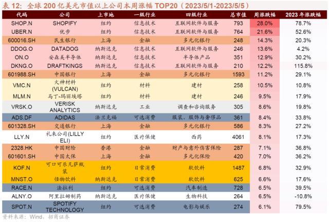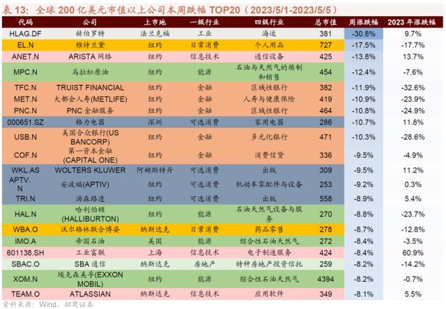 过去一周大涨的200亿美元以上市值公司中,信息技术、金融行业公司居多;过去一周领跌的200亿美元以上市值公司中,可选消费、能源行业公司居多。