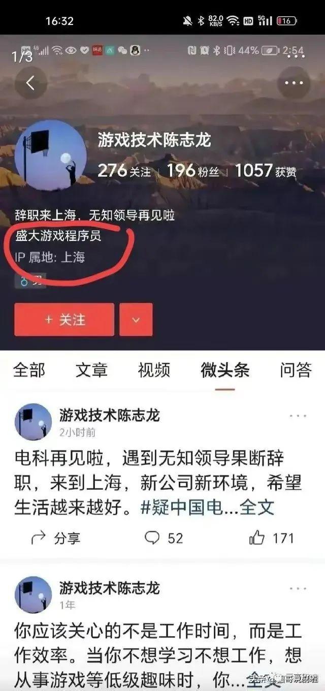 与此同时, 有网友扒出了名为“游戏技术陈志龙”的今日头条账号,其个人介绍为“盛大游戏程序员”。