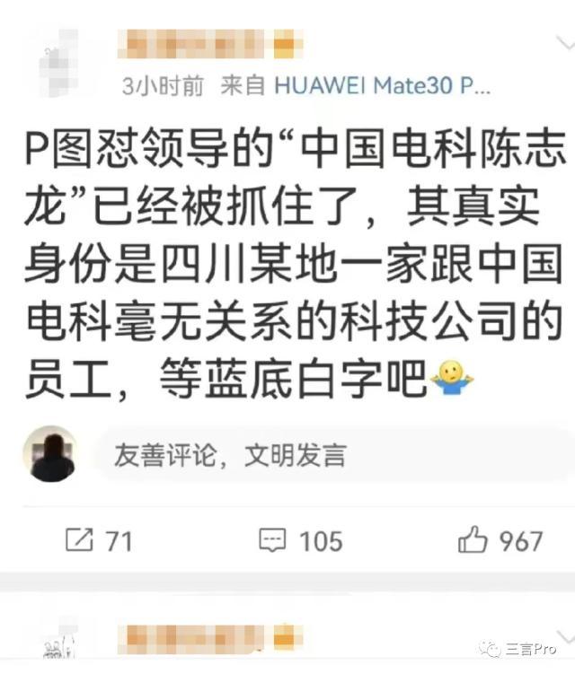还有网友爆料称,陈志龙已经被抓,其真是身份是四川某地一家跟中国电科毫无关系的科技公司的员工。