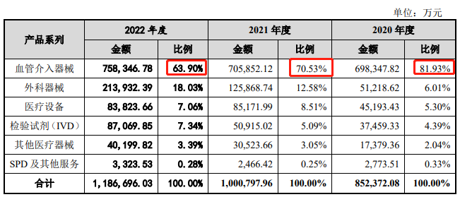关于毛利率,建发致新在申报稿中表示,公司综合毛利率略低于同行业可比公司,主要系产品结构不同所致。2020年至2022年,血管介入器械是公司的主要收入来源,占主营业务收入的81.93%、70.53%、63.9%,血管介入器械单价相对较高,存货周转率较高,同时一般无需开展产品宣传或推广等销售服务,对应毛利率较低。