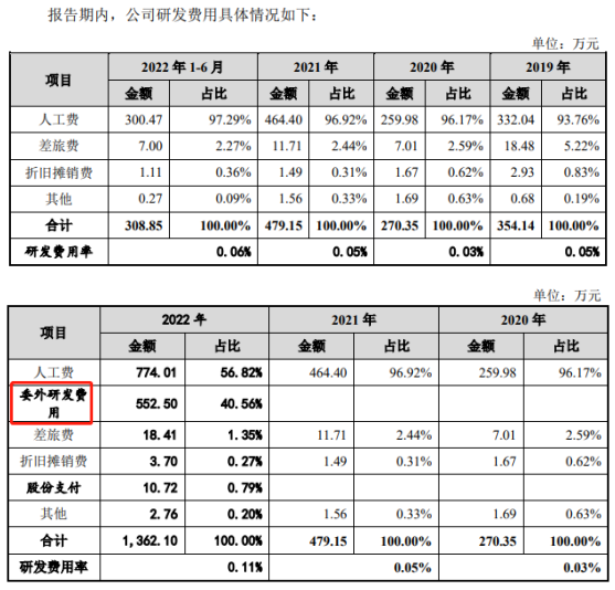 2022年下半年,建发致新委外研发费用为552.5万元,使得其2022年全年的研发费用达到1362.1万元。若无这552.5万元的委外研发费用,建发致新的IPO可能会遇到“障碍”。