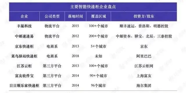 过去几年,智能快递柜基本形成了快递系、电商系和第三方企业三大阵营。快递系以中邮速递易、丰巢为代表;电商系以菜鸟、京东为代表;第三方企业多为快递运营管理公司,如近邻宝、格格货栈、日日顺、1号柜等。