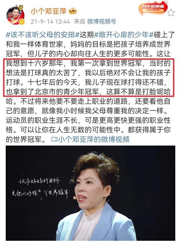 邓亚萍事业有成,一切尽在掌握,可儿子未来的职业道路,却让她焦头烂额。