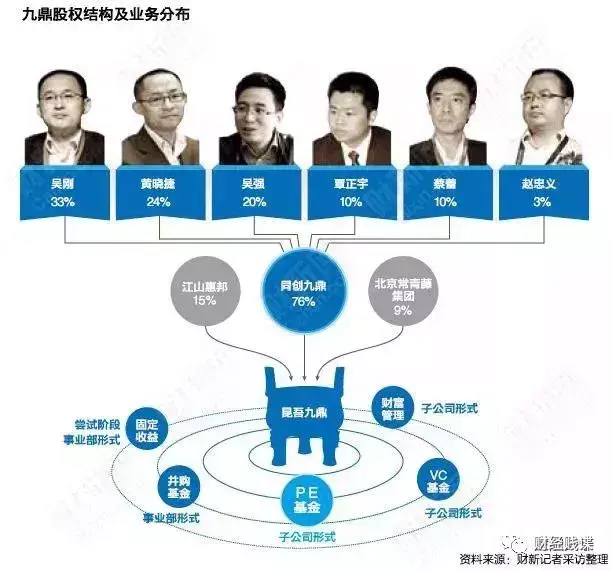 在2007年九鼎成立时还只是一家默默无闻的公司,2010年这家公司的注册资本也不过1000万元;而到了2015年,其市值规模超过千亿元。截至2017年底,九鼎旗下已拥有富通保险、九州证券、九鼎投资、九信资产以及人人行科技,布局覆盖私募、公募、保险、证券、期货、互联网金融等领域。