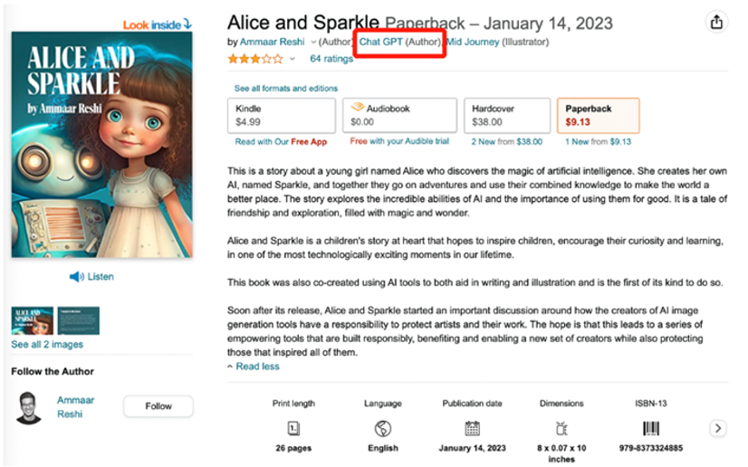 值得注意的是,除了审美观感,AI封面的另一个问题还涉及版权。2023年1月,图片提供商盖蒂图片社(Getty Images)表示正在起诉一家人工智能初创公司Stability AI,该公司创建了一种名为Stable Diffusion的文本到图像模型。盖蒂图片社指责这家公司非法使用其图片来训练模型。如果书籍封面是使用文本到图像平台制作的,其中数据集包含受版权保护的图像,则尚不清楚这样的封面可以在多大程度上受到法律保护。然而,目前亚马逊上有多本自行出版的书籍将ChatGPT列为作者,将AI绘画工具Midjourney列为插画家,甚至将两者同时列出。
