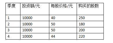 一年中,该股票均价为47.25元,40000元能够购买股票840股。而戴先生采用固定投入法却购买了850股,也就是说每股均价下降为47.06元。当然,如果戴先生40000元全部在第一季度进行投资,可以买到1000股,但是如果在第二季度买入却只能买到730股。