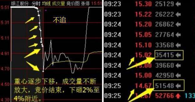 竞价分时常见两种。第一种是重心逐渐下移,不佳;第二种重心平稳,最佳。对应的案例有银江股份和中房地产,两者竞价均放量,但分时不同,最终的结果也不同。