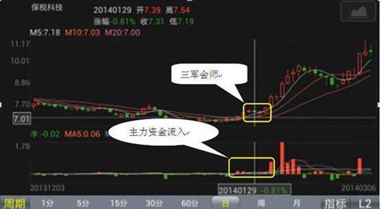 三军会师,看好后市。所谓“三军会师”,就是5日,10日,30日(也可以是20日)三条移动平均线,从高位向下运动到低位后,抬头向上,而且回合在一起。三线走到一起,意味下降行情的结束,新一轮上升行情的开始,此时买入,是难得的赚钱机会。5日,10日,30日三条移动平均线在低位会合时表明短中长线投资者的持股成本渐趋一致,除短线有微薄的利润外,中长线均无获利盘,上档抛压不重,股价容易上升。