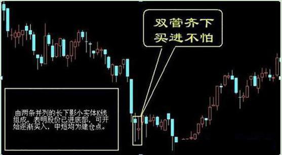 双管齐下,持股不怕。“双管齐下”,是由两条并列的长下影小实体的图线组成的图形。股价下跌到低位后,如果连续出现条长下影,小实体,且下影线的最低点较为接近时,就称为“双管齐下”。改形态的出现,表明股价已进入了底部,或者离底部不远,中长线投资者可以开始建仓,短线也可介入,后市获利一般较为可靠,“双管齐下”,是下档承接有力的迹象,股价跌到某一低点后,就能迅速被多头托起,说明做多的力量强大,同时也表明,在这一价位,抛压不重,后市能轻松地脱离底部,形成上升趋势。