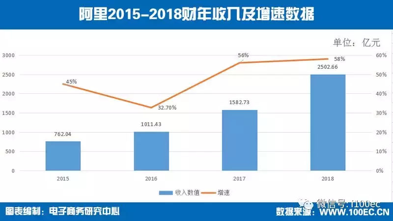 收入及近年增速数据:受中国及国际零售业务、阿里云持续快速增长、新收购业务等因素驱动,阿里巴巴集团收入2502.66亿元,同比增长58%,创下IPO以来最高增速。而在2015财年到2017财年的三年时间里,这一增速水平分别为45%,32.7%及56%,可以说18年又是一个新的突破。