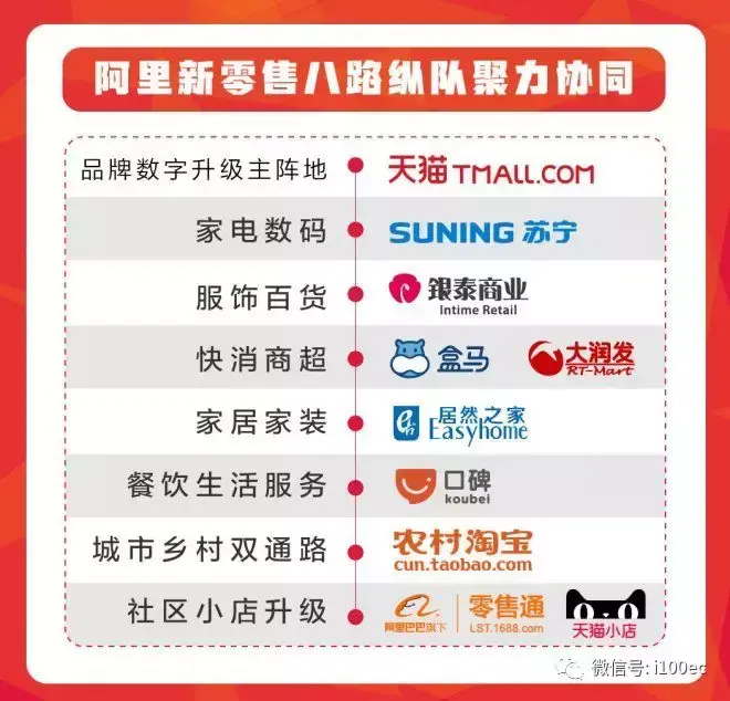 其中,最为典型的主力军无疑当属阿里"新零售八路纵队",分别聚焦在与我们每一位消费者生活息息相关的八个行业,包括: