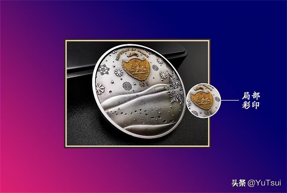 采用特殊金属上色工艺在金属币上印制彩色图像。局部上色仅在部分钱博会熊猫加字币上出现,产生了画龙点睛的艺术效果。