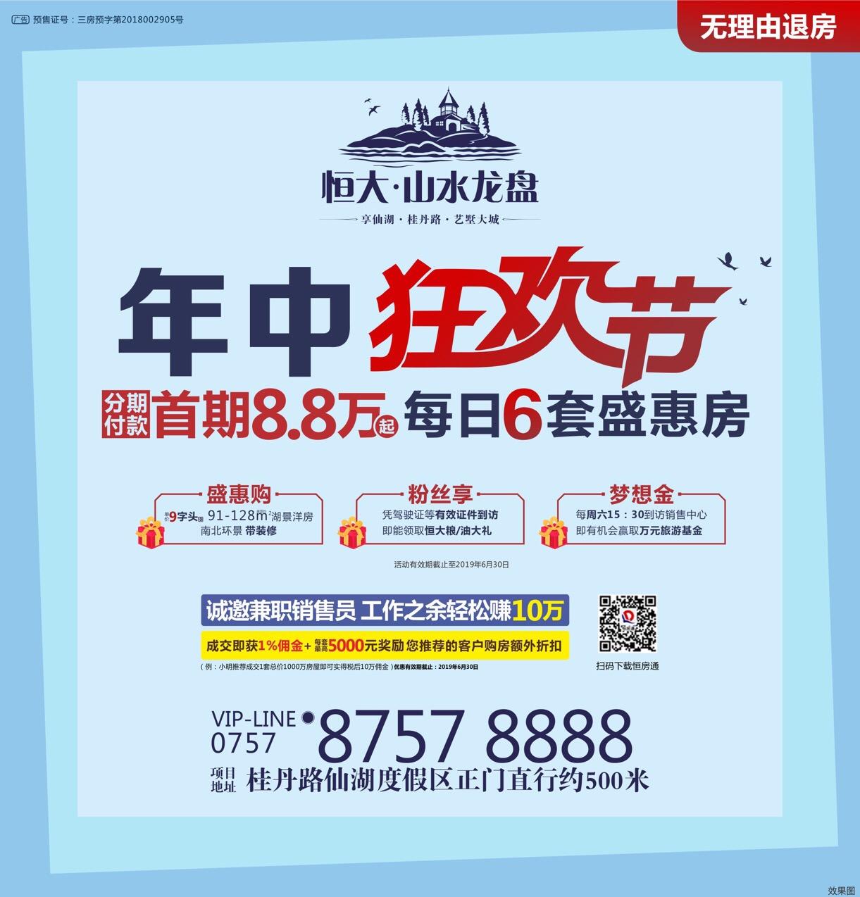 年中粉丝狂欢季,分期付款,首期8.8万起,每日6套特惠房,凭驾驶证等相关证件到访更有恒大豪礼相送。