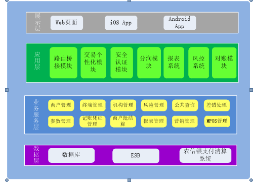业务服务层:为应用层提供基础模块,各类基本事务的处理,包括商户管理、终端管理、机构管理、风险管理、公共查询、差错处理、参数管理、记账凭证管理、商户批结算、报表管理、营销管理、MPOS管理。