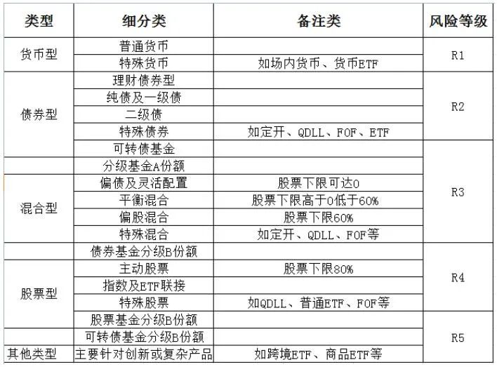 根据《证券期货投资者适当性管理办法》及《基金募集机构投资者适当性管理实施指引(试行)》等相关规定,在综合参考产品类型、投资方向和投资范围、流动性、到期时限、结构复杂性、募集方式等因素的基础上,可以对产品或者服务风险等级依照其风险水平由低至高划分为不同的等级(R1至R5),便于投资者和销售机构了解产品的风险属性。以某基金公司为例,基金产品评级等级如下:
