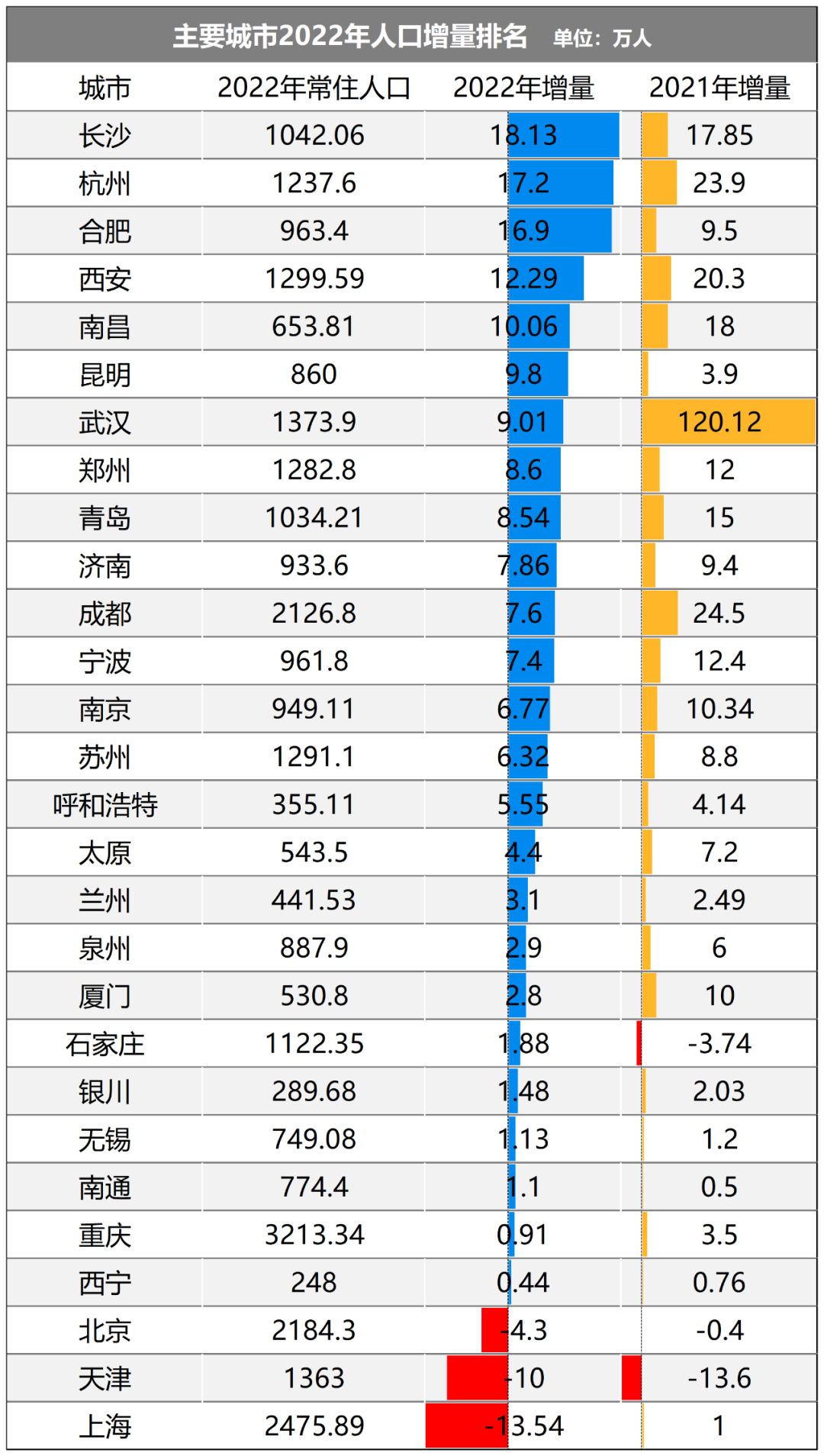2022年,包括京津沪在内的众多城市,人口都是负增长的,但长沙净增18.13万人,超过杭州,稳居全国主要城市第一名。