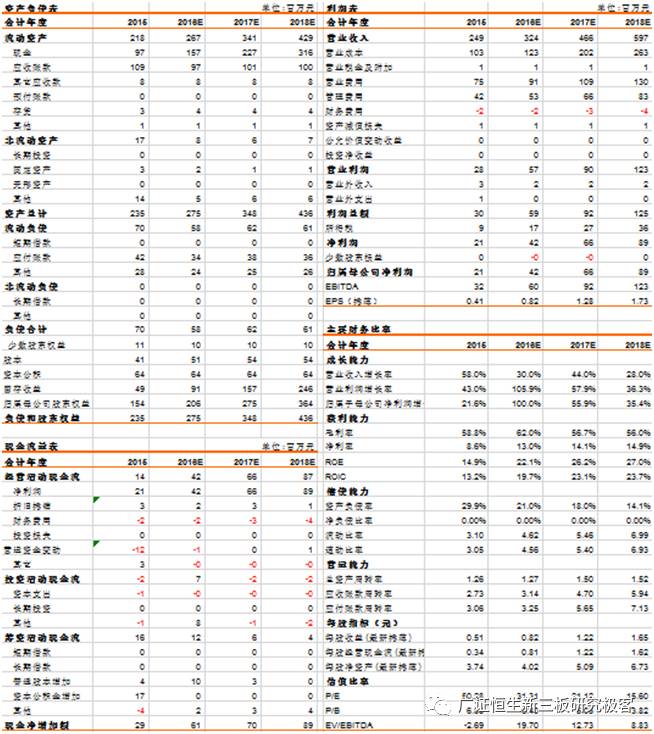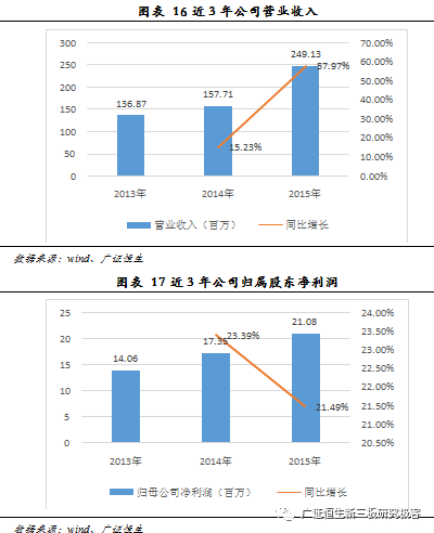 2016年,预计公司营收规模达3.24亿,同比增长30.00%,归属母公司股东净利润达4217万,同比增长99.99%。 2017年、2018年公司营收分别达到4.66亿和5.97亿,同比增长44%和28%,归属母公司股东净利润达6576万和8901万,同比增长分别为55.94%和35.36%,公司处于快速增长轨道。