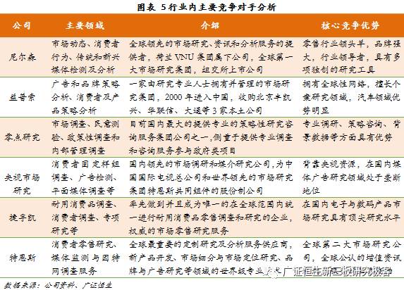国内较强劲的竞争对手有央视市场研究、零点研究等,央视市场研究公司为中外合资公司,拥有央视背景资源,在国内的媒体广告研究领域处于垄断地位。零点研究与慧辰资讯业务规模接近,专注于专业调研、策略咨询等领域。