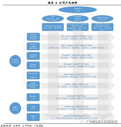 公司基于经典研究理论的六大产品线:覆商务咨询、消费者洞察、创新研究、渠道研究、传播研究、满意度和忠诚度研究。覆盖了企业市场运营的全过程,是