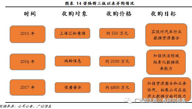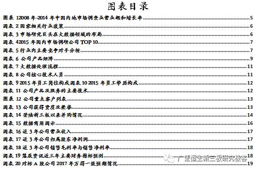 2014年接收丹思卡威业务和人员,加强在快速消费品领域的市场研究能力;2015年收购上海汇知意德、实现了对汽车行业数据资源及研究能力的整合;2016年初完成了对CRM咨询解决方案提供商瑞斡信息的股权收购,加强在快消领域贴身化数据服务能力;合资成立慧骋科技,成立TMT研究事业部,覆盖包括快消、以及商业智能为代表的新兴科技领域。目前通过融资,开始开拓医药、金融、化工、公共事务行业的业务,未来进一步形成多业务线格局。