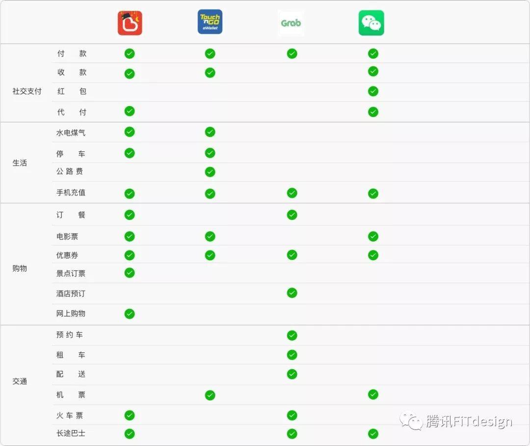 ,如:Boost核心在购物,同时拓展到生活;TouchGo核心在生活,周时拓展到购物;Grab核心在交通出行,同时拓展到购物,WechatPay核心在社交支付,同时拓展到购物、交通。