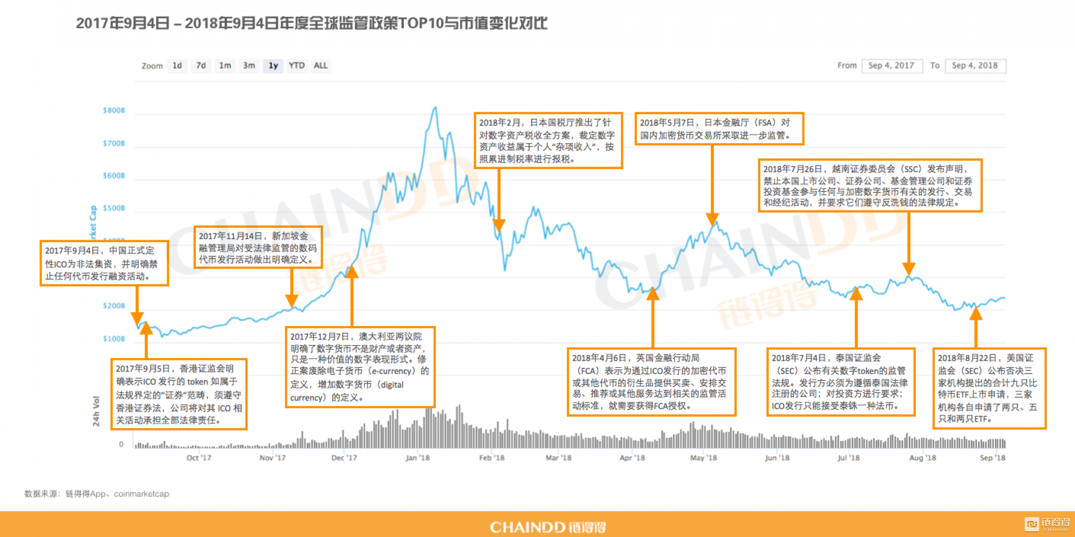 政府对于数字货币的监管措施和政策,成为数字货币市场过山车式暴涨暴跌的重要推手。链得得梳理了近一年来全球监管政策的十大事件,并与全球数字货币市场进行对比,进一步分析数字货币市场和政府监管政策的关联度影响。