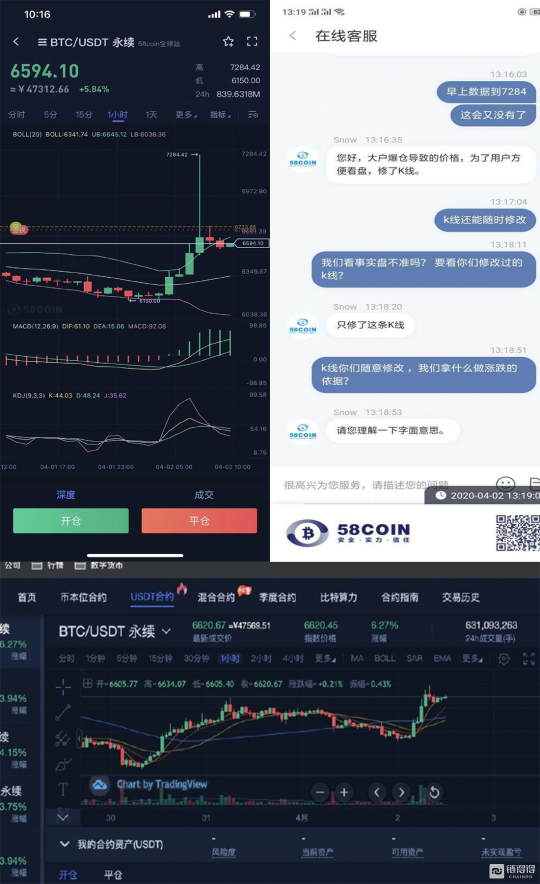 2020年4月2日7点30分左右,比特币迎来了一波拉升。据58Coin全球站显示,BTC永续合约从6598美元直接涨到7284美元。当时火币全球站和OKEx皆报价6770美元左右。一位在58Coin平台交易的投资者,随后在投资人维权平台上表示,他设置了7200美元的平仓价格,虽然58Coin当时的K线显示最高价格超过了7200美元(按道理应在7200美元平仓,并获取该价格处的收益),但他的账户却在6680美元处就被强制平仓,损失了大量预期盈利。而很快,作为达到用户设置平仓价格的证据——指示着7284.42美元的这根K线“神秘”消失了。换句话说,这根被消失的K线已无法证明价格曾达到该用户的设定值。