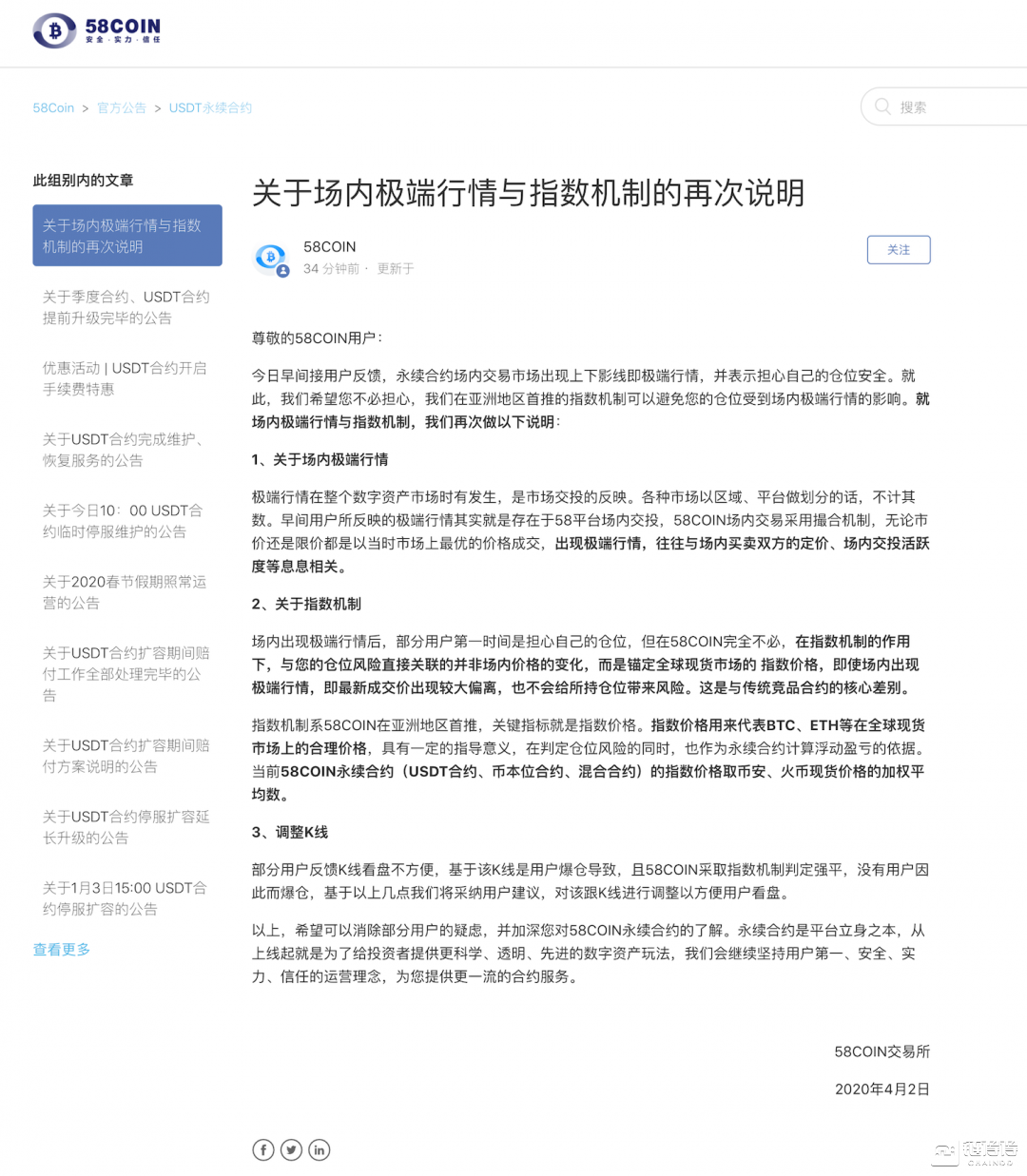 58Coin官方随后发布公告,称并没有用户因此爆仓,承认了对K线做出修改的事实,只是其对修改行为的解释是为了方便用户看盘。如今,这条官方公告已经无处可寻。