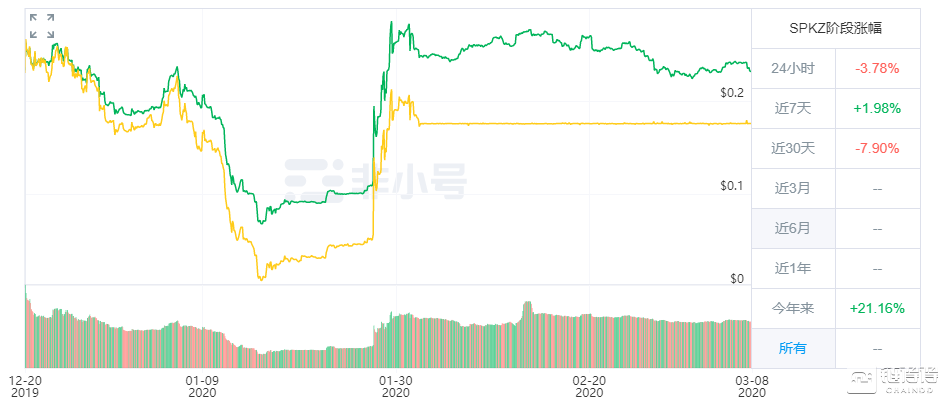2019年12月,SPOKKZ开始在模式币项目PGS的社群中进行推广,并在社区中空投了糖果。伴随着两次跳水行情,SPOKKZ项目代币SPKZ在7月底价格约0.018美元,不足发行价的7%。