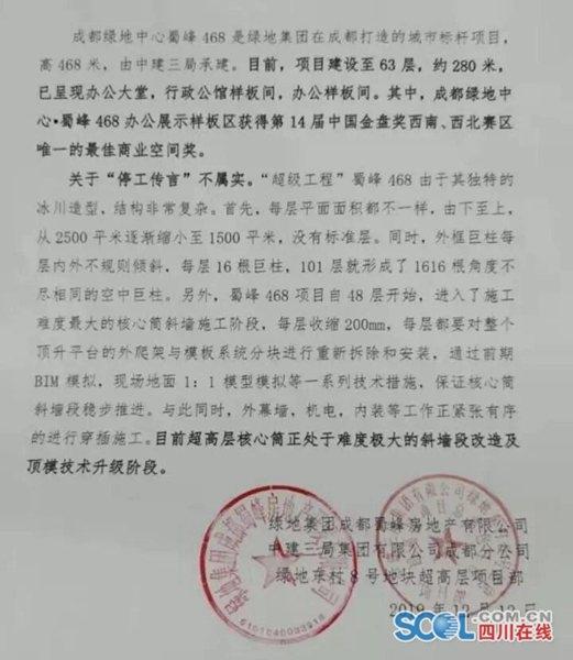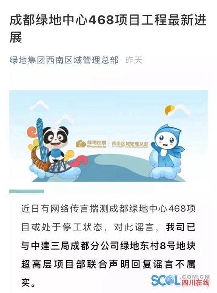 此外四川在线记者查询到,由“绿地集团成都蜀峰房地产开发有限公司”为帐号主体的认证微信公众号“绿地集团西南区域管理总部”,于2019年12月17日发布一篇《成都绿地中心468项目工程最新进展》文章,其中表示:“近日有网络传言揣测成都绿地中心468项目或处于停工状态,对此谣言,我司已与中建三局成都分公司绿地东村8号地块超高层项目部联合声明回复谣言不属实。”该文章表示,目前,其超高层核心筒正处于难度极大的斜墙段改造及顶模技术升级阶段。
