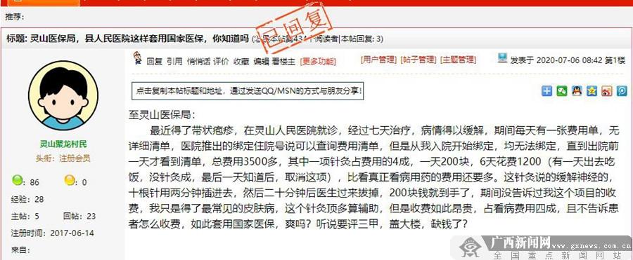 7月6日,钦州市灵山县人民医院对《灵山医保局,县人民医院这样套用国家医保,你知道吗》帖文进行回应: