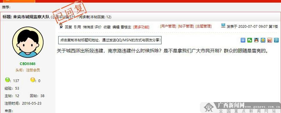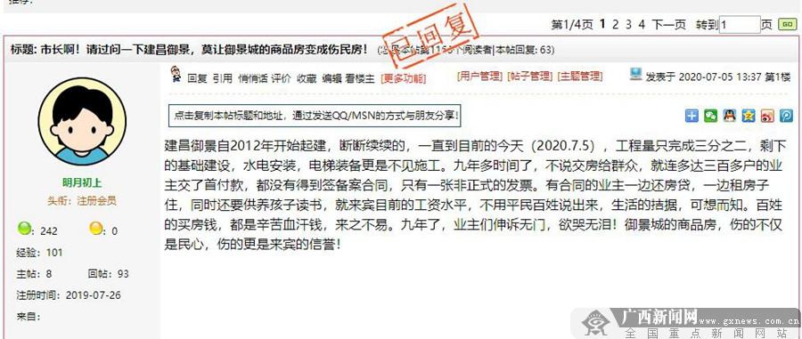 7月8日,来宾市住房和城乡建设局对《请过问一下建昌御景,莫让御景城的商品房变成伤民房!》帖文进行回应: