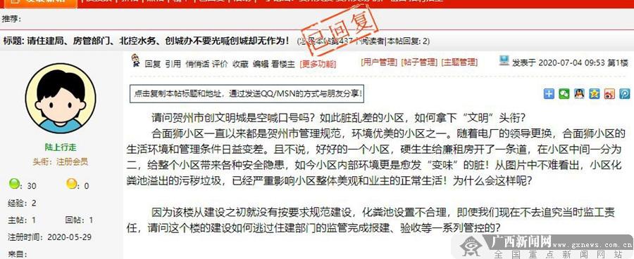 7月6日,广西贺州北控水务有限公司对《请住建局、房管部门、北控水务、创城办不要光喊创城却无作为!》帖文进行回应: