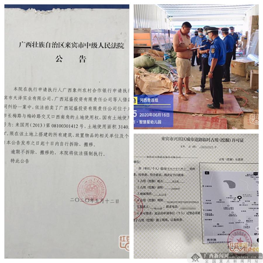 2020年6月15日,我局执法人员到南京路北面进行调查。经查,该处建设是来宾市兴桦商务服务有限公司搭建的,该公司办理有《来宾市兴宾区城市道路临时占用许可证》,占用期限为2年。