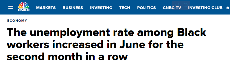 根据美国劳工部(Labor Department)7日公布的一份报告,非裔劳动力失业率在6月份升至6%,达到去年8月份以来的最高水平,并再次接近白人失业率的两倍,二者之间的差距进一步扩大。同一时期,美国西班牙裔及亚裔劳动力的失业率分别上升4.3%和3.2%。