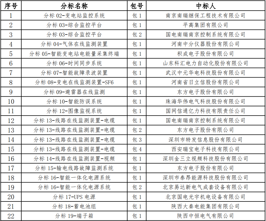 国网陕西省电力有限公司2023年第一次物资集中规模招标采购项目中标候选人公示活动已经结束,现将中标结果公告如下: