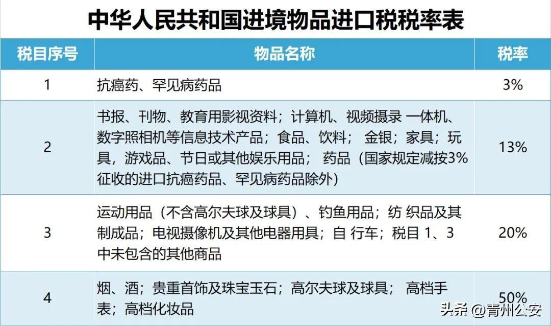 :进口税额=完税价格×进口税税率。根据《国务院关税税则委员会关于调整进境物品进口税有关问题的通知》,按3%、13%、20%、50%四档税率计征。