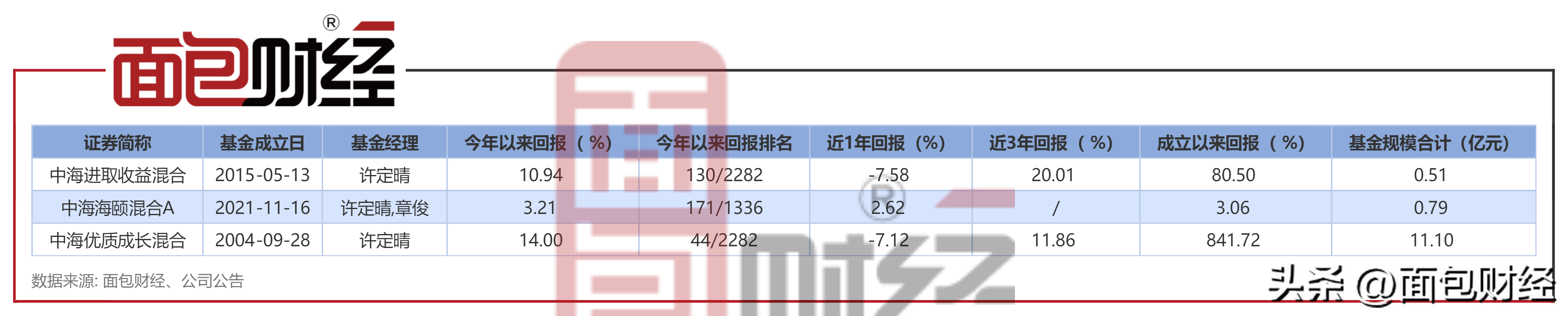 目前,许定晴主要管理中海优质成长混合、中海海颐混合、中海进取收益混合共3只产品(包括共同管理产品),上述产品合计规模约12.40亿元。