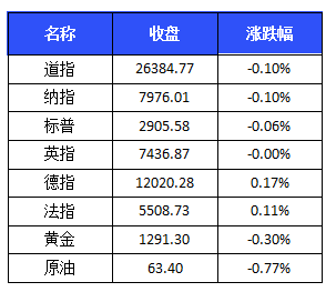 美三大股指周一小幅下跌。道琼斯工业平均指数下跌27.53点,跌幅0.10%,报26384.77点。纳斯达克综合指数下跌8.15点,跌幅0.10%,报7976.01点。标普500指数下跌1.83点,跌幅0.06%,报2905.58点。