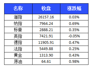 美东时间周三,美股三大指数小幅上涨。截至收盘,标普500指数上涨10.01点,涨幅0.35%,报2888.21点;道指上涨6.58点,涨幅0.03%,报26157.16点;纳指上涨54.97点,涨幅0.69%,报7964.24点。美联储重申今年不再加息符合预期为市场带来提振。此外,美国3月消费者信心指数(CPI)环比增长0.4%,创14个月新高,符合市场预期。