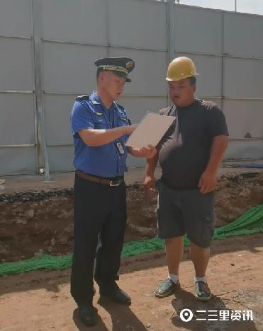 当天,华商报-二三里资讯记者直击执法现场。支队市政执法大队深入到施工现场开展“学规范 保安全 促生产”的执法检查活动,近距离向市民群众和施工人员解读市政法律法规,就城市道路挖掘,城市排水排污等工作的审批流程向市民进行了宣传,提醒施工人员戴好安全帽,注意防暑防高温。