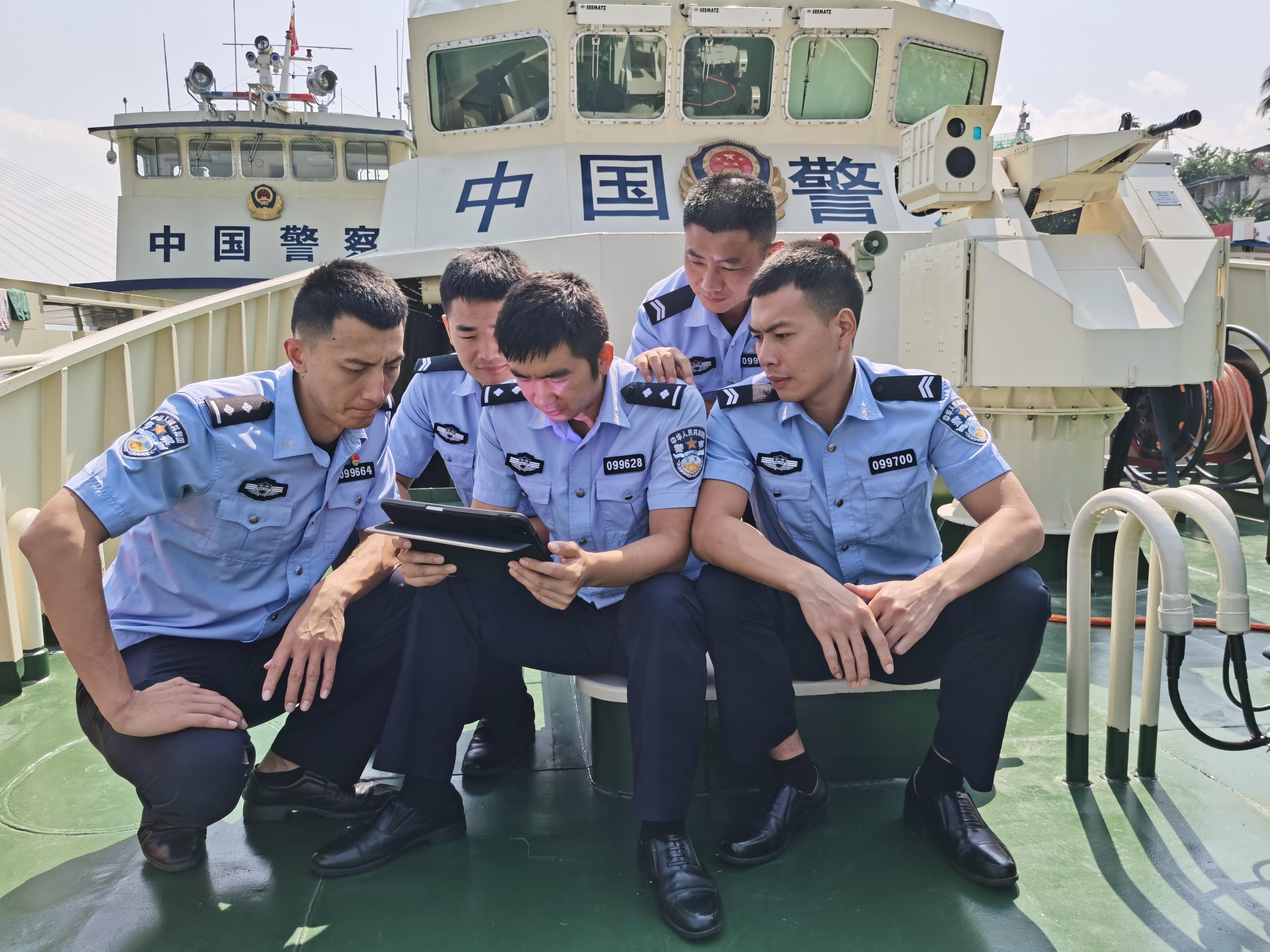 民警在执法艇前甲板收看党的二十大开幕会盛况。